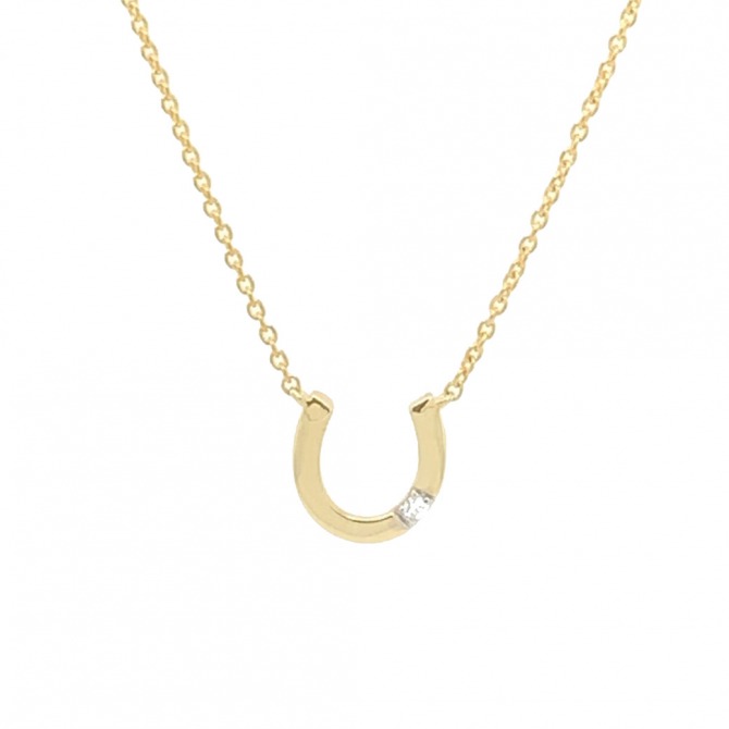 A modern yet simple ‘lucky’ 9ct yellow gold horseshoe pendant with a diamond detail. The horseshoe consists of one round brilliant diamond. The necklace has a fixed 9ct yellow gold trace chain which can be worn at either 16" or 18". According to superstition, horseshoes bring protection and luck, but whatever your belief, these earrings will look stunning in every setting.