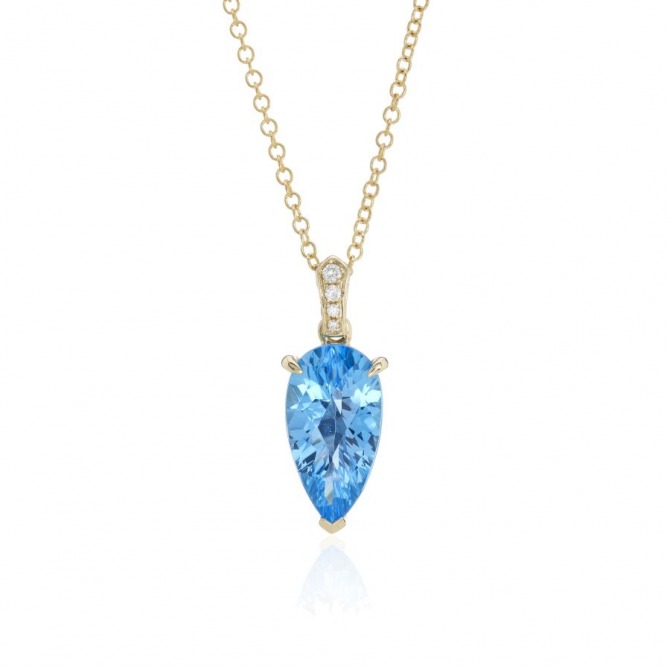 Adorn your neckline with the captivating sparkle of this Swiss Blue Topaz pendant necklace. Its eye-catching blue gemstone is beautifully cut in a teardrop shape and framed by delicate gold claws with diamond bale, set against a backdrop of warm gold that exudes timeless elegance.