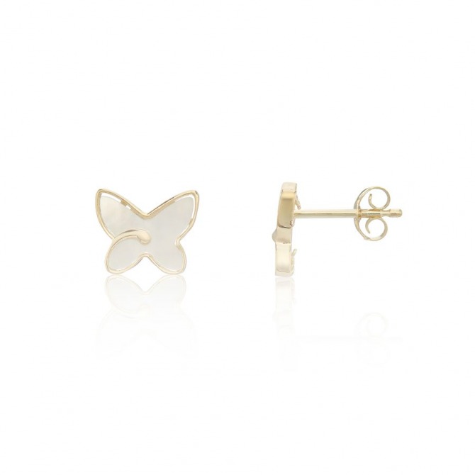 Elevate your everyday style with these dainty stud earrings, crafted in gleaming yellow gold. Each earring features a captivating butterfly mother of pearl, its unique shape and translucent beauty adding a touch of sophisticated charm to any ensemble. These earrings effortlessly blend classic elegance with contemporary design.