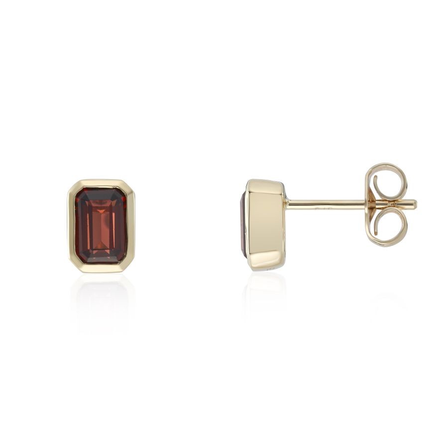 Two octagonal Garnets set into polished Yellow Gold with a simple post and butterfly fastening. Complementing colours of stone and metal and a super sleek, clean design. These stud Earrings are one of our best sellers and are a perfect and popular gift. Wear alone or with matching Ring and Necklace.