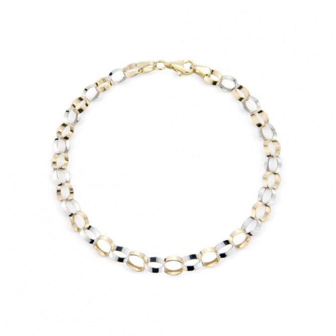 9ct two colour bracelet in yellow & white gold. The bracelet comprises of open oval links of classic design. The bracelet is 7 inches in length and is fastened with a lobster clasp fitting. This item is available as a matching necklace.
