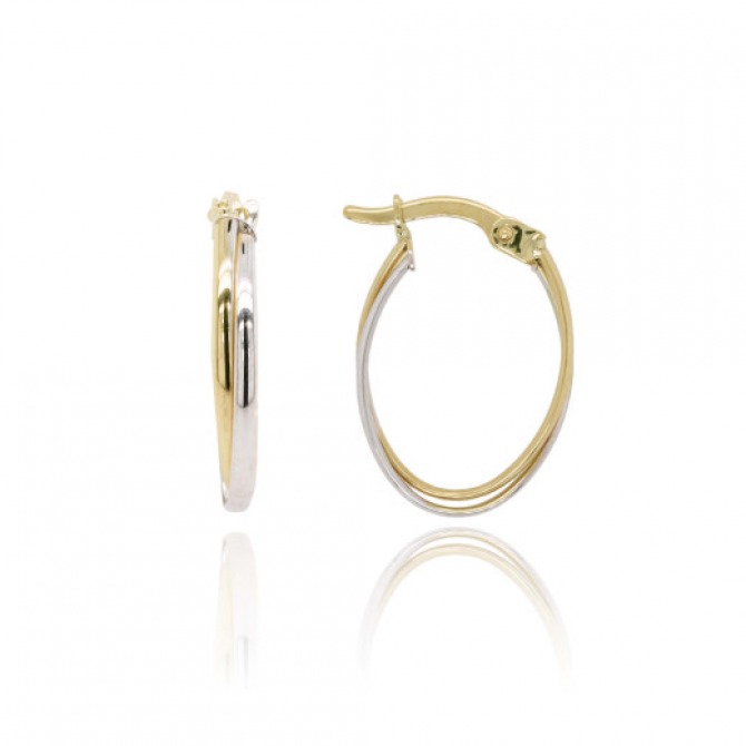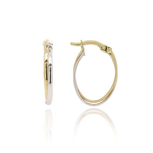 Overlapping Gold filaments forming an oval shape visible from side profile. 9ct yellow and white gold are the materials used. A design that is suitable for everyday wear.