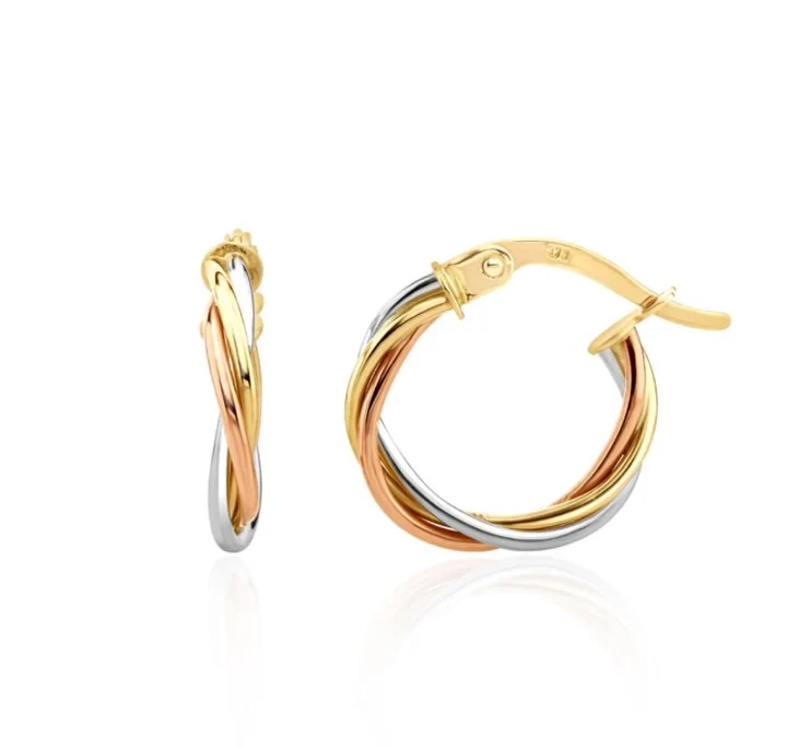 9ct Yellow White & Rose Gold Russian Hoop Earrings