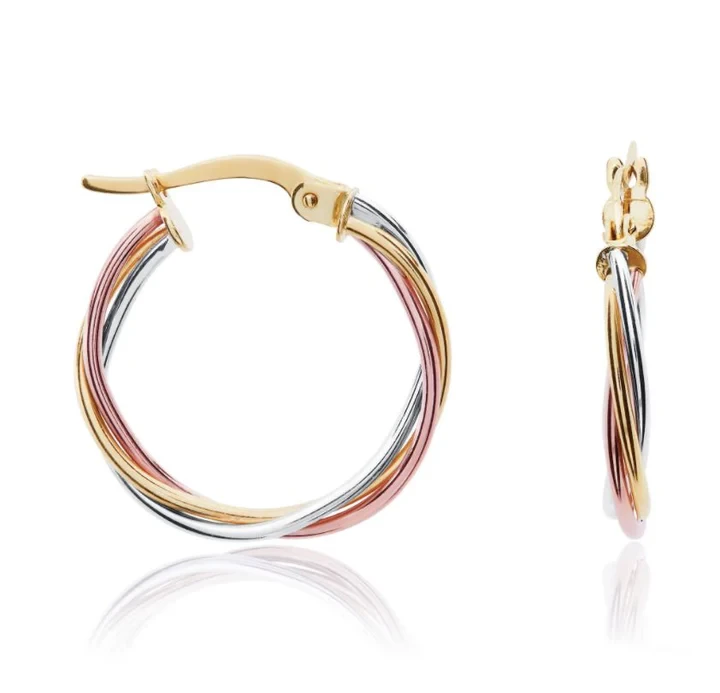 9ct Yellow White & Rose Gold Russian Hoop Earrings