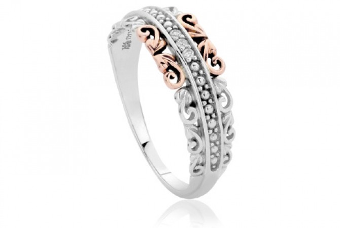 Am Byth® is forever at the heart of Clogau. With its elegant Tree of Life® filigree and rare Welsh gold, this timeless collection of signature pieces is the ultimate way to profess your endless love. The silver and rose gold ring is set with 3 diamonds & contain rare Welsh gold.