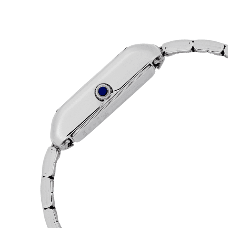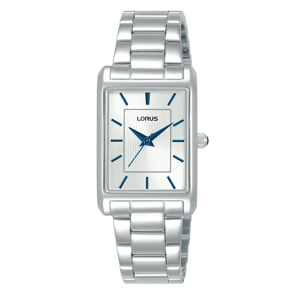 This timepiece is designed for classic luxe style. Its rectangular soft dial showcases a subtle sunray effect with a striped centre pattern, whilst the stainless steel multi row bracelet is comfortably stylish. Its blue-coloured hands and markers complement the overall aesthetic, creating a harmonious and refined look.