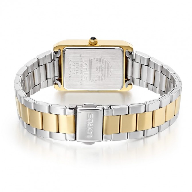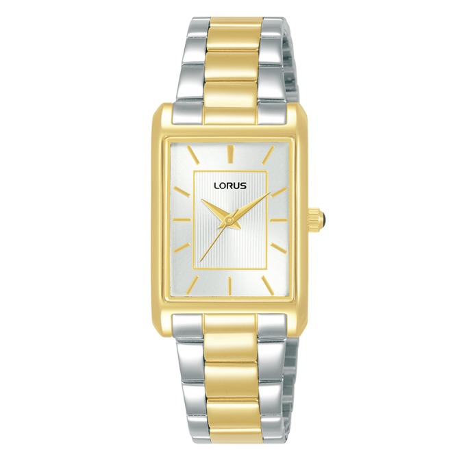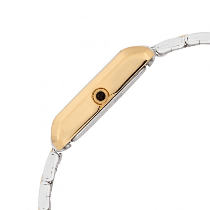 This timepiece is designed for classic luxe style. Its rectangular soft dial showcases a subtle sunray effect with a striped centre pattern, whilst the two tone gold colour-accented stainless steel multi row bracelet is comfortably stylish. Its gold effect hands and markers complement the overall aesthetic, creating a harmonious and refined look.
