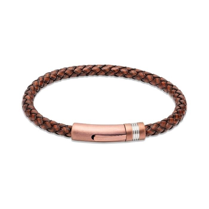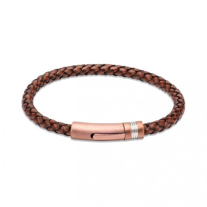 Unique & Co. Gents Collections are inspired by architecture and engineering: beautiful yet functional, and combining innovative materials with real attention to detail. This antique brown woven leather bracelet features a stainless steel and rose gold IP-plated clasp which is hard-wearing, durable and won’t tarnish.