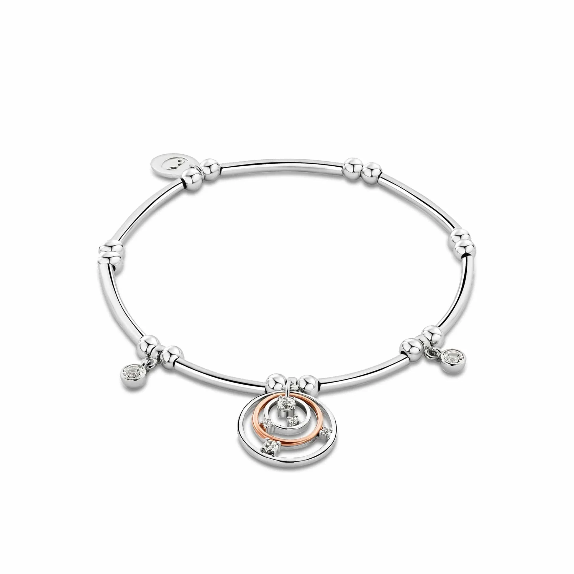 The shining star of any outfit, our Awyr Y Nos Silver Affinity Bracelet – named after the Welsh for “night sky” – features rings of sterling silver and 9ct rose gold representing the orbits of white topaz gemstone planets around a central sun-like stone. Stack, layer and build your Affinity bracelet collection to tell your own unique story through beautiful Clogau jewellery.
