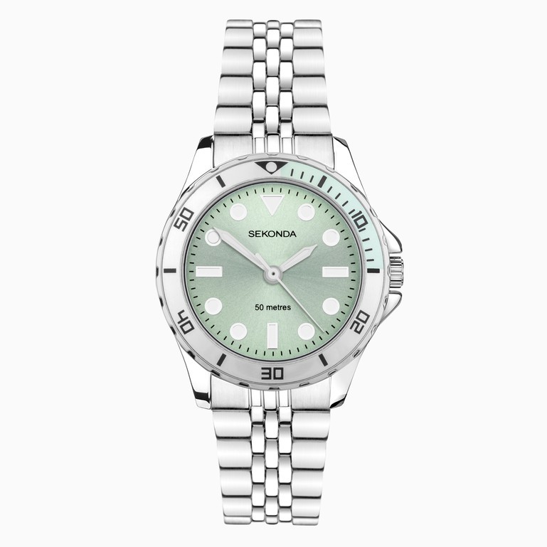 The watch has a round, ion-plated silver alloy case with a fixed silver and light green bezel and a light green dial. The watch is fastened with a stainless steel bracelet and is water resistant up to 50 metres.