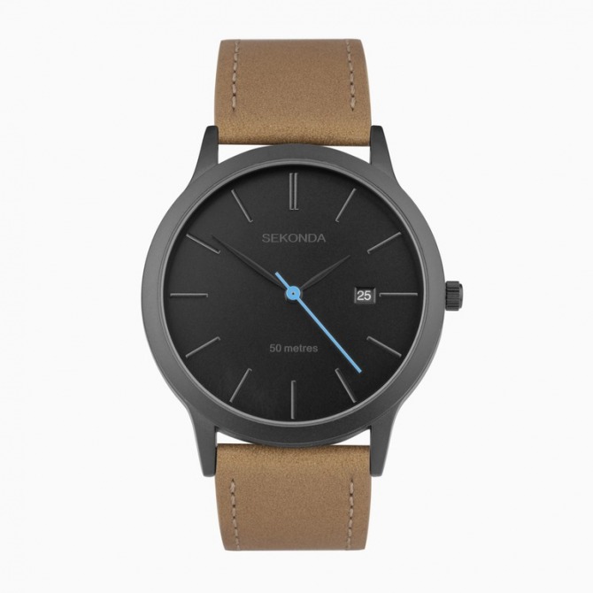 The watch has a round, ion-plated black alloy case and a black dial with a date display. The watch is fastened with an interchangeable tan, leather upper strap with quick release spring bars and up to 50 metres water resistance.