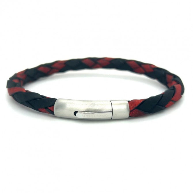 This gents bracelet features a robust red and black braided design, secured with a sleek stainless-steel clasp. The perfect accessory for a bold and confident look.