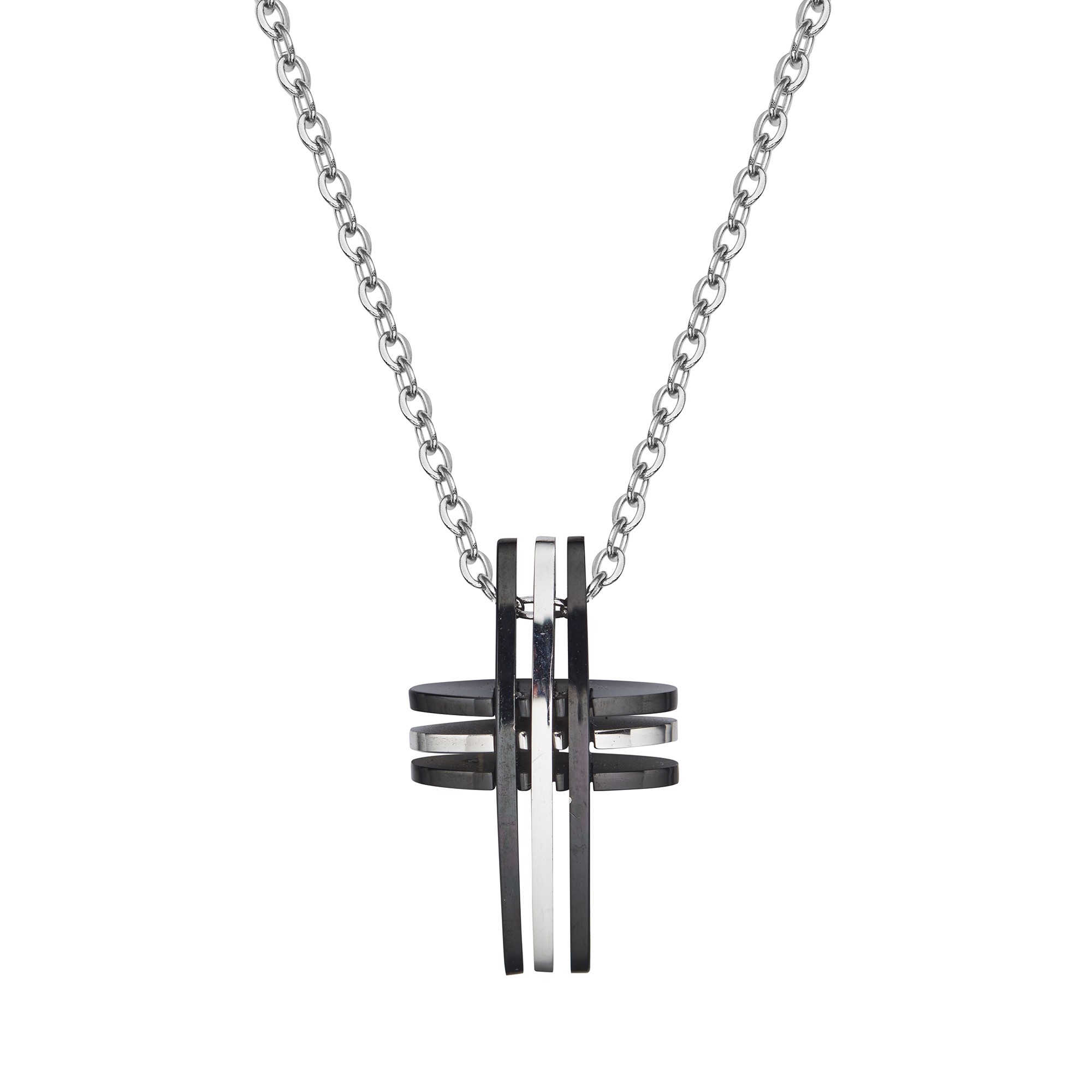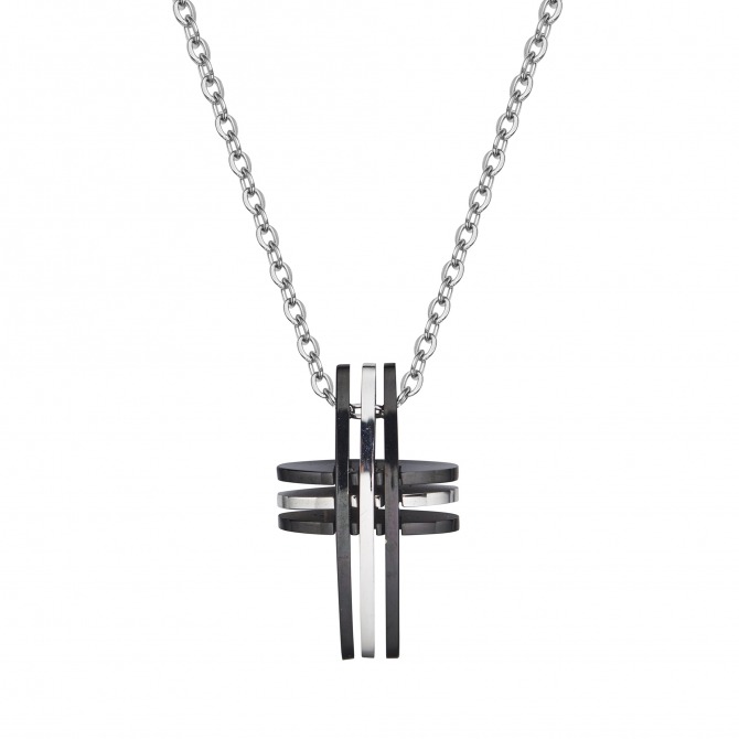 Stainless steel with black plate, two colour cross pendant on a 50cm stainless steel chain.