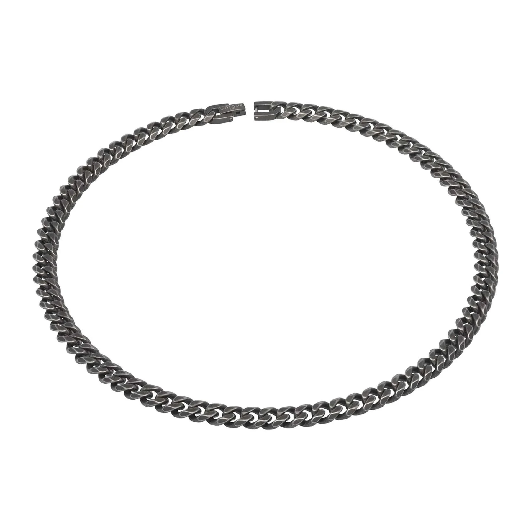 Stainless steel with antique black plated curb style chain which measures 50cm in length.
