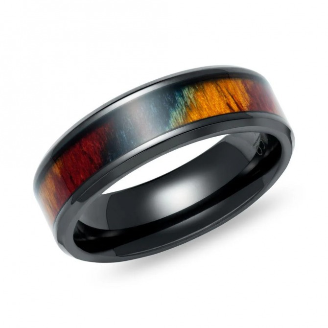 Black Zirconium 7mm with Multicoloured Wood Inlay Ring