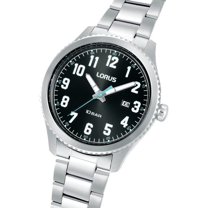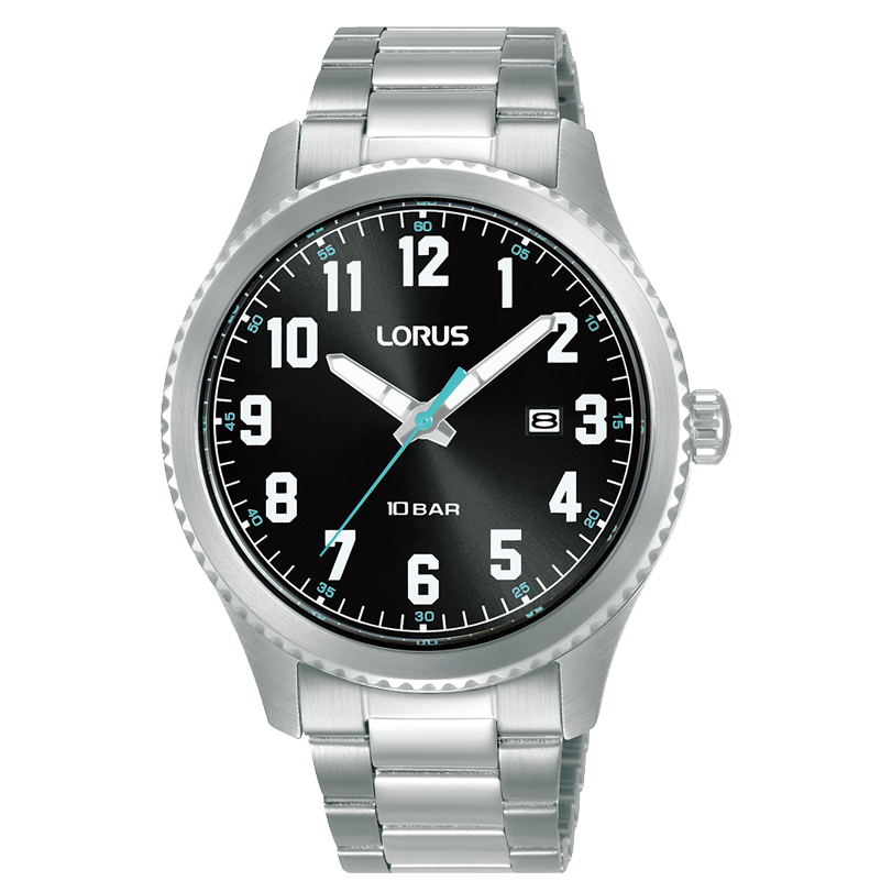 A watch for all occasions, the attractive black sunray dial of this watch is enhanced by semi-luminous hands, clear Arabic numerals, a date window and a striking blue second hand, alongside a Stainless steel bracelet. With water resistance up to 100 metres, this watch combines style and functionality, making it an ideal accessory for both everyday wear and special occasions.