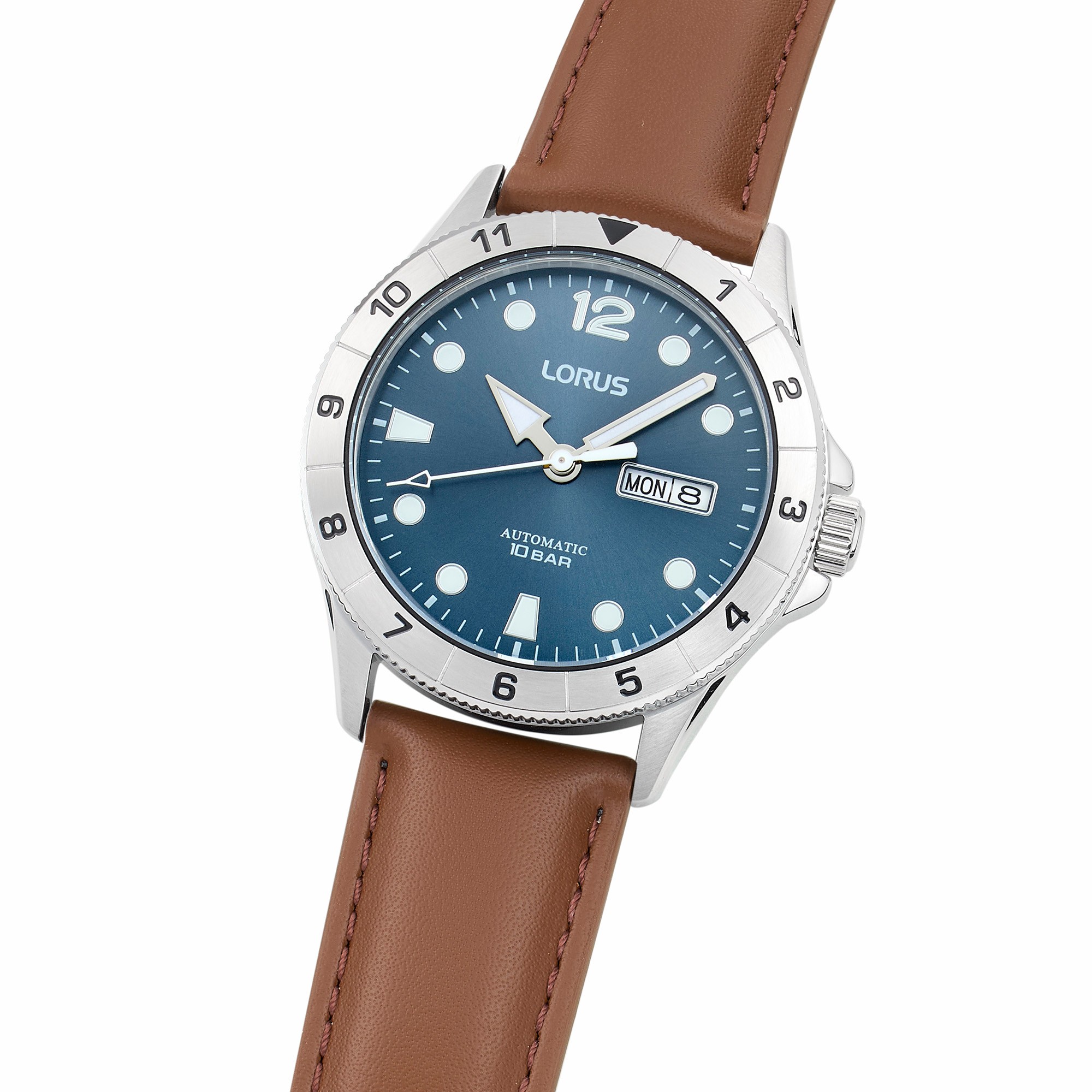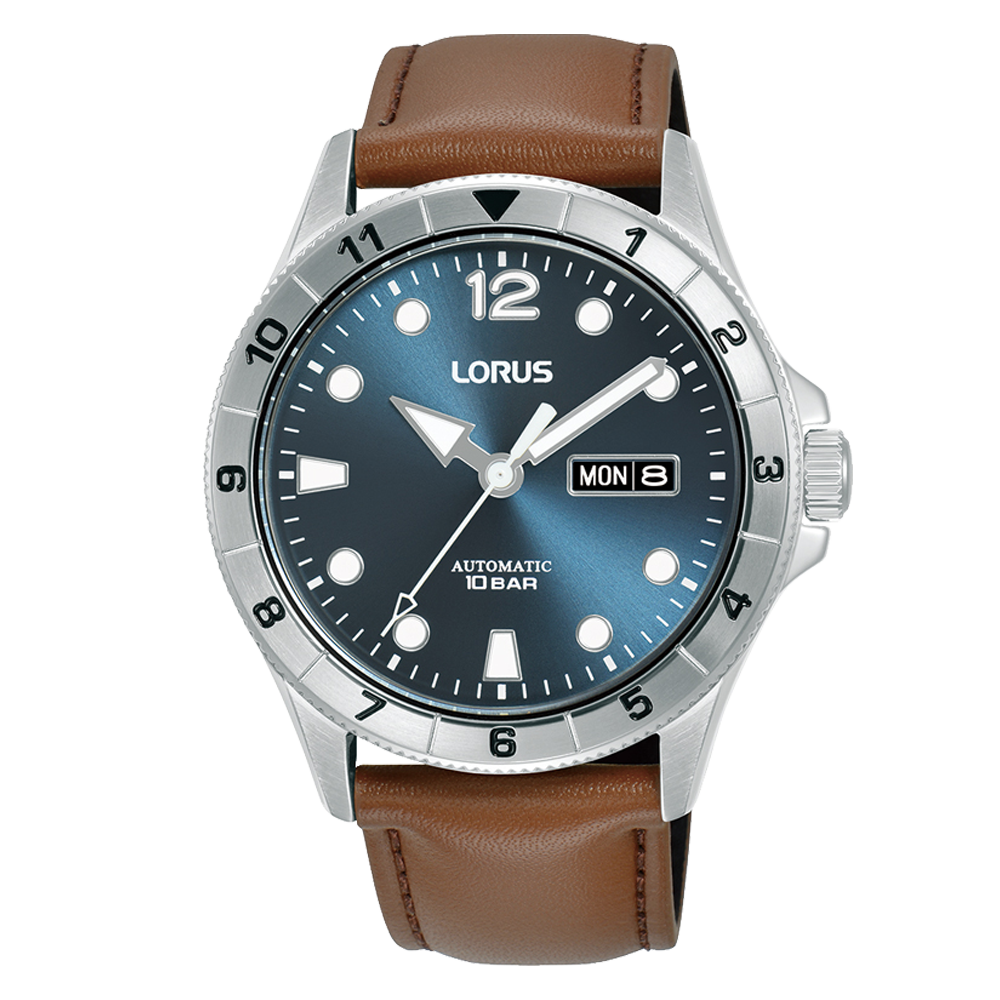This Lorus Men’s Automatic combines timeless design with reliable function. Featuring a blue dial with semi-luminous hands and markers to ensure clear visibility, even in low light and it has a day/date window for extra convenience. The brown leather strap offers a classic touch and a comfortable fit.The self-winding movement provides easy timekeeping as your watch charges with the motion of your wrist.