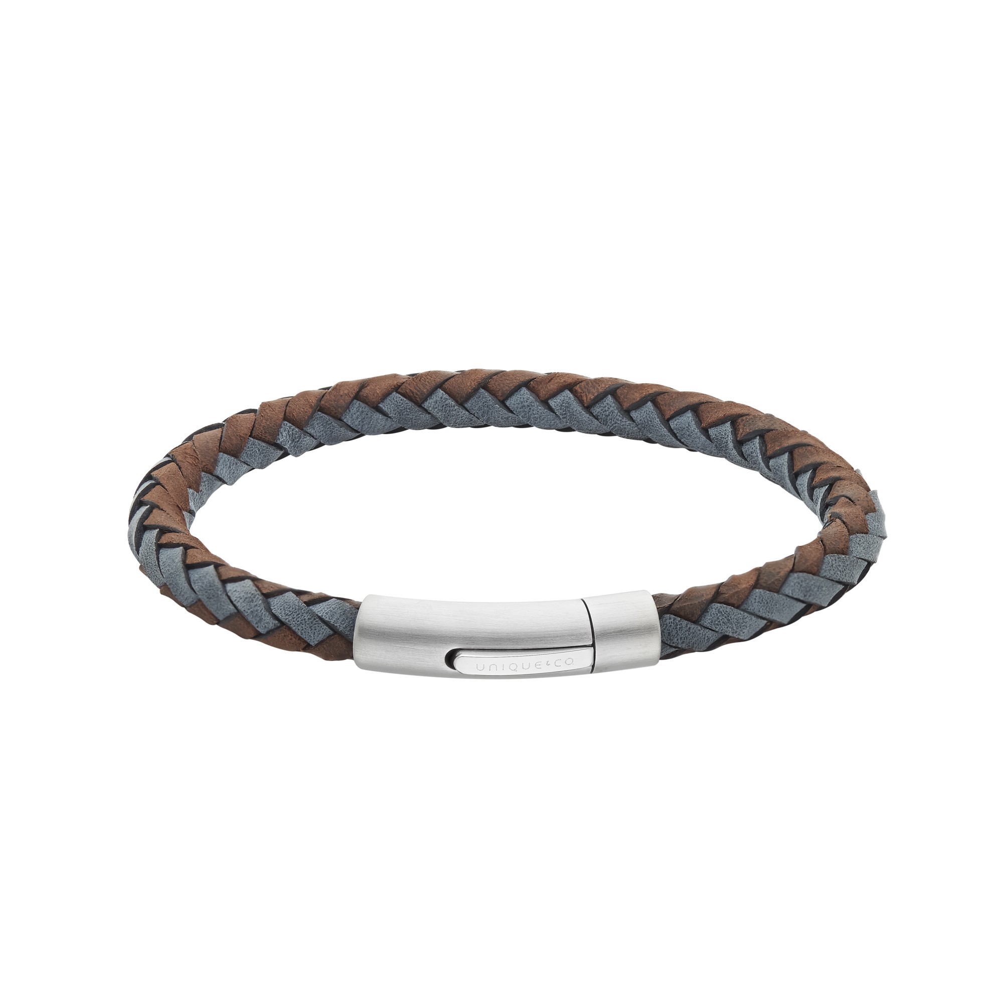 This gents bracelet features a robust brown and antique blue braided design, secured with a sleek stainless-steel clasp. The perfect accessory for a bold and confident look.
