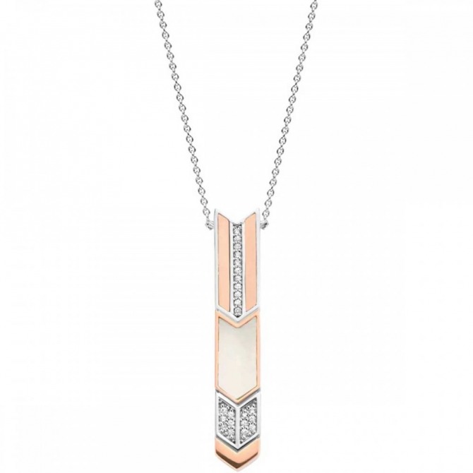 This TI SENTO silver necklace 3954MW has an iconic stylised arrow feather pattern. White zirconia pave, rose gold plating and sterling silver create a soft feminine piece. Let this arrow dangle from your neck to always keep in touch with your direction.