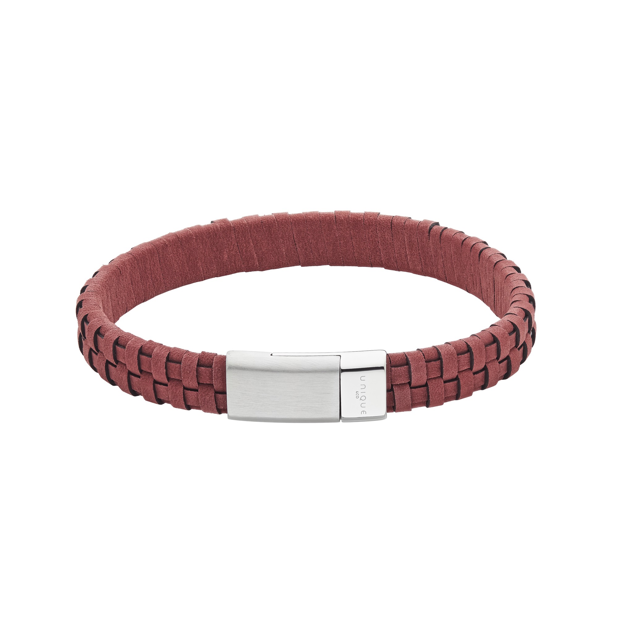 This gents bracelet features a robust burgundy suede leather design, secured with a sleek stainless-steel clasp. The perfect accessory for a bold and confident look.