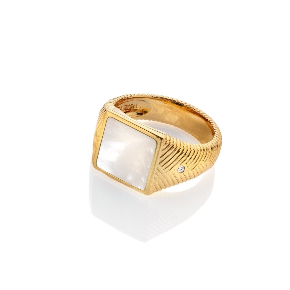 Before I started working on the design of this collection with Hot Diamonds, I didn't wear too many gemstones as I preferred a simple gold finish. Now, I have completely changed my mind, and I think breaking up the gold with a splash of natural gemstone creates a stunning overall look, and you seem to agree as our Pearl and Malachite designs are among your most-loved! This jewel is crafted from genuine Mother of Pearl, 925 sterling silver, a real hand-set diamond and 18ct gold plate. You need it in your life! This pearl section of this ring measures 11mm in width.