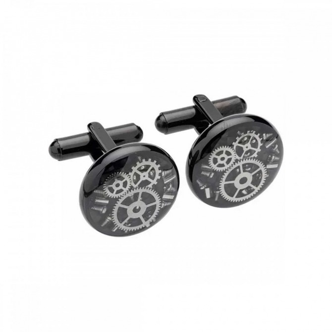 Gents Black IP Plating Stainless steel Circle Black Carbon Fibre Cuff Links with watch movements, perfect match for your shirt either into the office or for a night out.