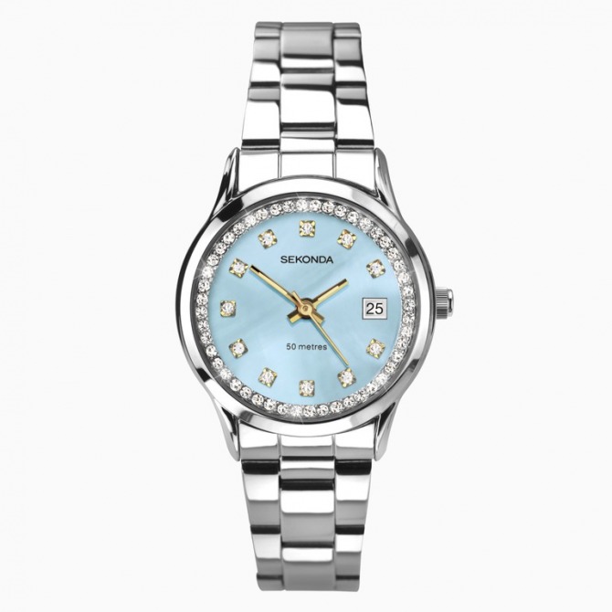 This watch has a round, silver ion-plated alloy case with a stone set, blue Mother-of-Pearl dial. Fastened with a stainless steel bracelet, features include a date display and up to 50 metres water resistance.