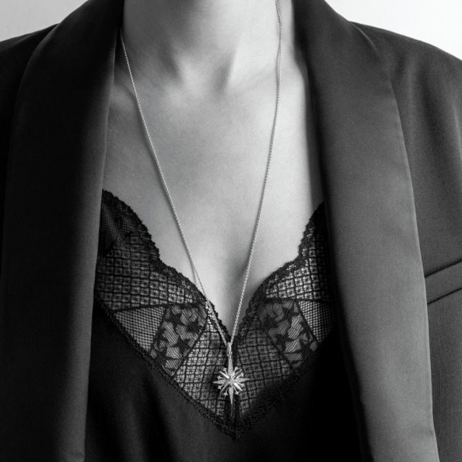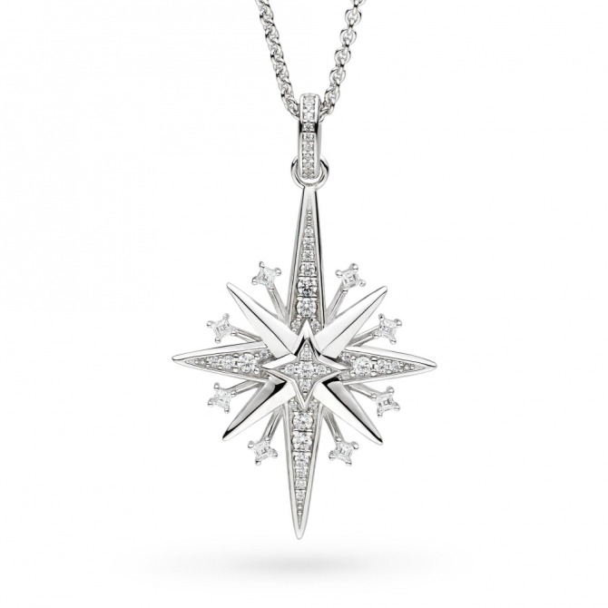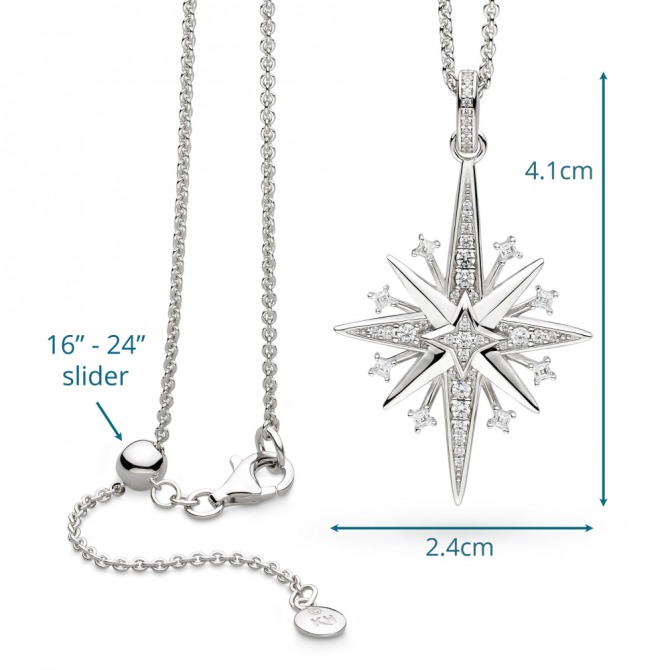 Commanding attention with its celestial brilliance, the special winter 2025 edition Céleste North Starburst Grande Slider Necklace is the true showpiece of our special limited edition collection. Featuring a generously sized eight-pointed star, each point is meticulously adorned with Pavé-Set Cubic Zirconia, while eight additional star bursts radiate from behind — creating a dazzling total of 16 points of sparkle. Suspended from an elegant Pavé-set bale, this statement pendant glides effortlessly along a 16–24" adjustable slider chain, offering versatile styling from close to collarbone to dramatic drop – the choice is yours! Bold, radiant, and full of symbolic meaning, this sterling silver necklace captures the essence of celestial style. It’s the ultimate gift or a powerful addition to your own jewellery story.