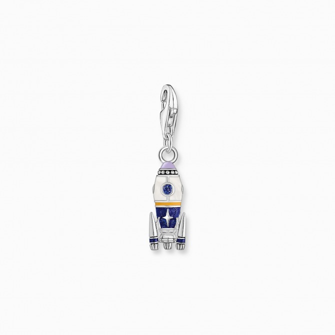 Rocket charm: made of high-quality, slightly blackened 925 Sterling silver, this three-dimensional pendant is adorned with many details. It is hand-painted with dark blue, orange, violet and white cold enamel. The engines, windows and the rocket’s drive are elaborately designed. Violet, orange, blue and red stones embellish the windows and drive. Fine stars and a moon masterfully complement the design. Thanks to its snap hook, this charm can be hooked onto Charm Club necklaces and bracelets – by itself or combined with further charms. It is the perfect gift for a special occasion.