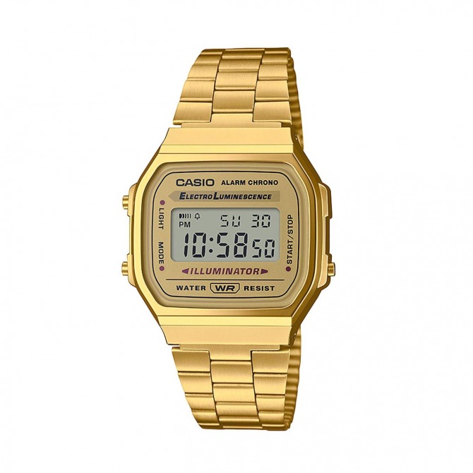 A classic CASIO design, part of the Vintage Retro Collection. This timepiece features a digital display, an Illuminator, daily alarm, and stopwatch. Resistant to minor splashing.