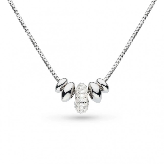 The Coast-inspired necklace fit for the Riviera, the organic pebble shapes of our Tumble collection have been given the glamorous treatment with the accent sparkle of the cubic zirconia. The central tumbling roundel has been fully encased in a dusting of micro pavé, making this simple yet elegant sterling silver necklace the perfect accompaniment for an evening date. Our classic 18-inch length is perfect for most necklines but is adjustable to 16 inches using the extra shortening link.