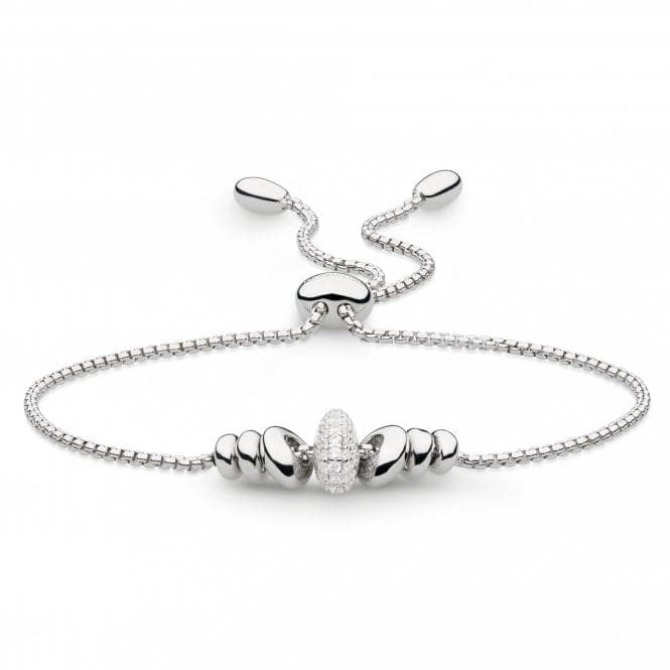 The Glistening version of our best-selling tumble toggle bracelet, this sterling silver wristwear piece is simply elevated with the addition of sparkling micro pavé set cubic zirconia along the central tumbling roundel. The central cluster of tumbling pebbles sits in a fixed position between two stoppers along the rounded box chain, each bead circling loosely in its set position. The tactile sliding toggle fitting is ingenious in its design, each strand of the chain channelled through its individual slider, allowing for a secure fit yet fully adjustable sizing.
