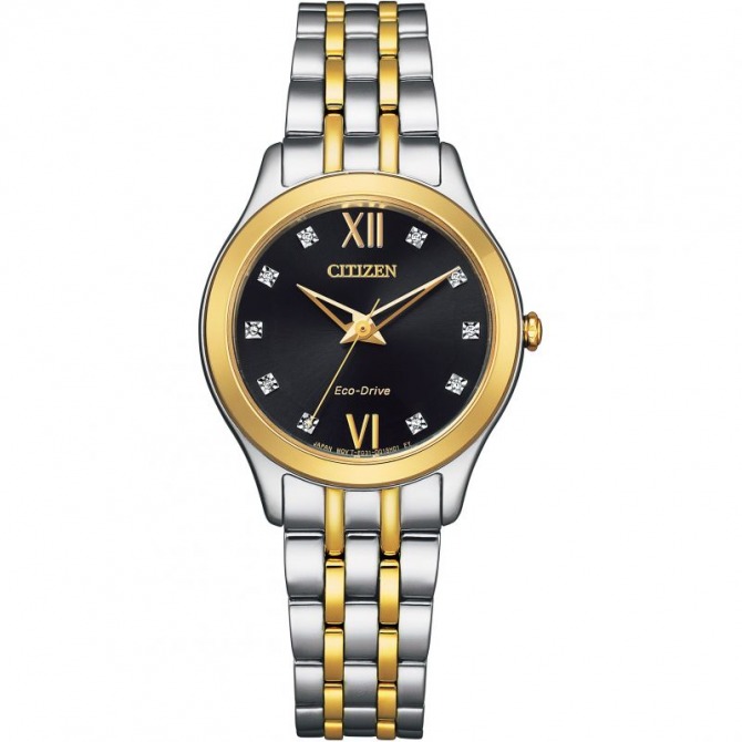 Add the perfect amount of sparkle to your watch collection with the Silhouette Diamond, featuring 10 diamonds delicately handset on a black dial. This timepiece will seamlessly fit into your wardrobe with its stylish two-tone stainless-steel bracelet. Sustainably powered by any light with Citizen Eco-Drive technology.