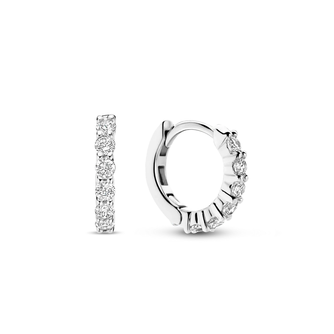 These TI SENTO silver huggies 7956ZI flaunt a dazzling pave of white cubic zirconia stones that exude timeless elegance and sophistication. Crafted from premium 925 sterling silver, they are then coated with platinum to protect them from daily wear and keep them luminous. Their 12mm diameter allows a comfortable and trendy fit. Their petite size and versatile design make them ideal for wearing solo for a subtle yet edgy look or for layering with other earrings for added drama and flair. Indulge in the timeless allure of our silver huggies with larger cubic zirconia stones and elevate your Ear Party to new heights. These huggies are sure to become a cherished staple in your jewellery collection, adding a touch of glamour and sparkle to every outfit. Like all our jewellery, these huggies are nickel-free and hypoallergenic, ensuring not just style, but also comfort and quality.