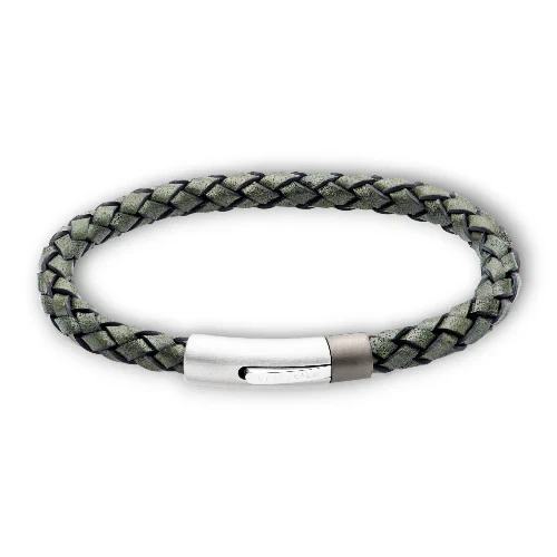 Gents dark green leather bracelet with black edge, gunmetal ion plated matte and polished stainless steel clasp.