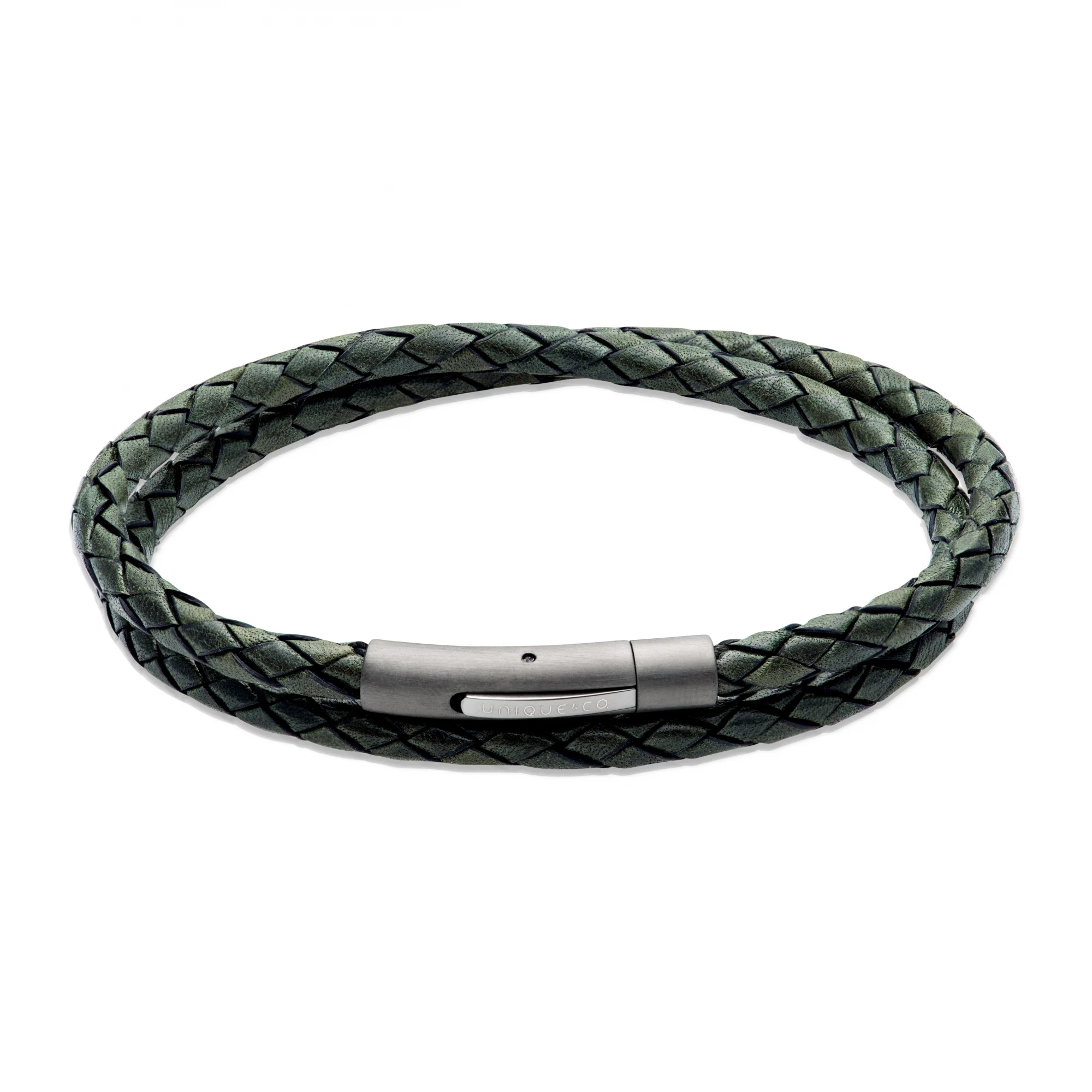 A stylish dark green gents leather bracelet with a black edge and Gun Metal IP and a matt/polished steel clasp.