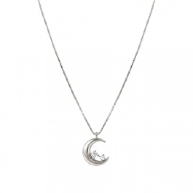 Silver necklaced available in two variants with two different finishes applied with a galvanic process; yellow gold or white rhodium treated finish. The Moon shaped pendant, ancient and meaningful symbol becomes a precious amulet for the wearer.Sophisticated, refined, this jewel will surely be a treasured gift.