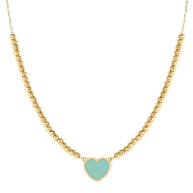 Stainless steel necklace. The distinctive yellow PVD finish adds an elegant touch. A single delicate Heart-shaped pendant, available with either Pastel Pink or Pastel Green or sophisticated Mother of Pearl for a touch of elegance. The necklace is innovative because it is half chain profile and then the central front portion has small sliding spheres on the chain. Emosfere Collection was designed for anyone who wants to show their personality through modern and colourful jewellery.