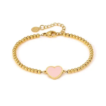High quality stainless steel bracelet. The yellow PVD colour coated finish adds a brilliant shine. The central Heart pendant is bold and vibrant, available in different colours: a delicate Pastel Green, a pallid Pastel Pink as well as refined Mother of Pearl. The chain is decorated with small sliding spheres that add a playful element to this sophisticated design. This jewel is the ideal choice for jewellery lovers who want to add a touch of light and personality to their summer look.