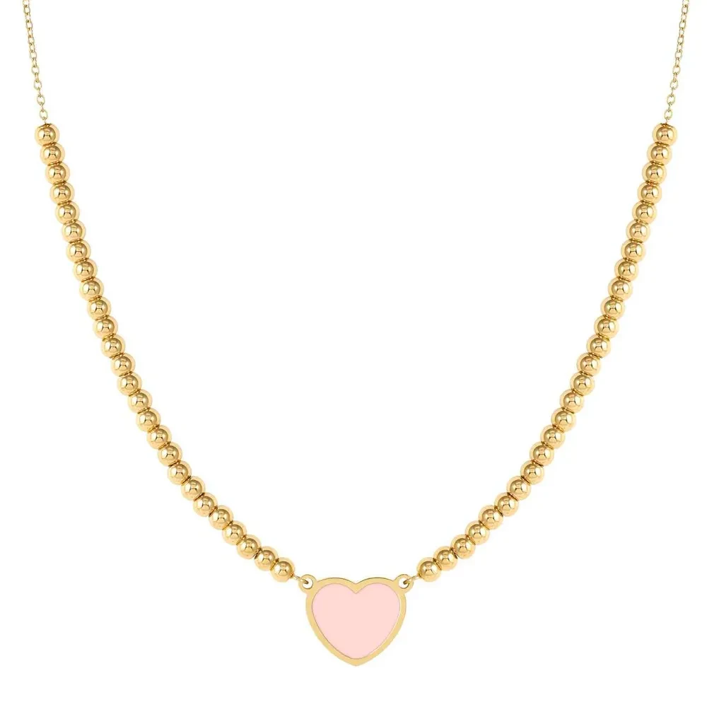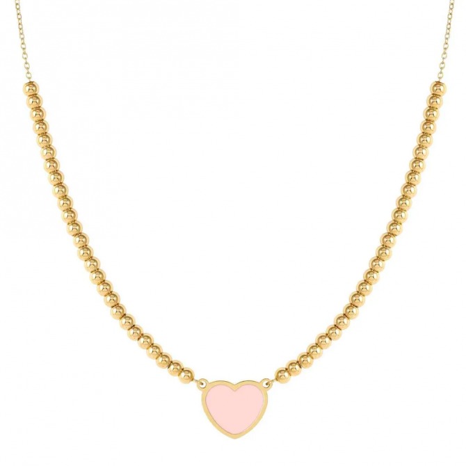 Stainless steel necklace. The distinctive yellow PVD finish adds an elegant touch. A single delicate Heart-shaped pendant, available with either Pastel Pink or Pastel Green or sophisticated Mother of Pearl for a touch of elegance. The necklace is innovative because it is half chain profile and then the central front portion has small sliding spheres on the chain. Emosfere Collection was designed for anyone who wants to show their personality through modern and colourful jewellery.