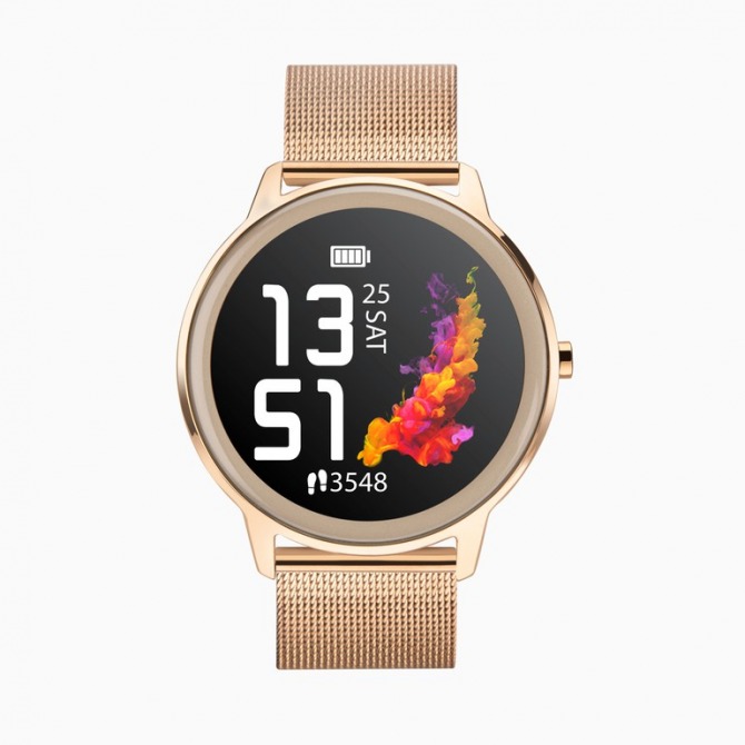 This Sekonda Flex smart watch features a rose gold coloured alloy case with a 1.1 inch, round, interactive dial. Features include step/distance/calorie tracker, sleep monitor, blood oxygen measurement, notifications & more. The watch is fastened with a 20mm rose gold coloured stainless steel mesh strap and has a water resistance rating of IP67. This means that the watch is splashproof and showerproof but not recommended for swimming or watersports.