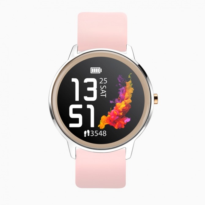 This Sekonda Flex smart watch has a silver alloy case with a 1.1 inch, round, interactive dial. Has a step/distance/calorie tracker, sleep monitor, blood oxygen measurement, notifications & more. The watch is fastened with a 20mm pink silicone strap and has a water resistance rating of IP67. This means that the watch is splashproof and showerproof but not recommended for swimming or watersports. Smart Watch. Smart choice.