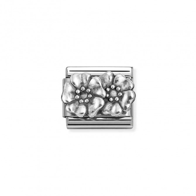 Original Nomination Classic Link in stainless steel with raised Double Flower symbol in sterling silver. Vintage effect achieved with artisanal oxidation treatment of sterling silver. Shine bright and add a romantic touch of nostalgia to your bracelet.