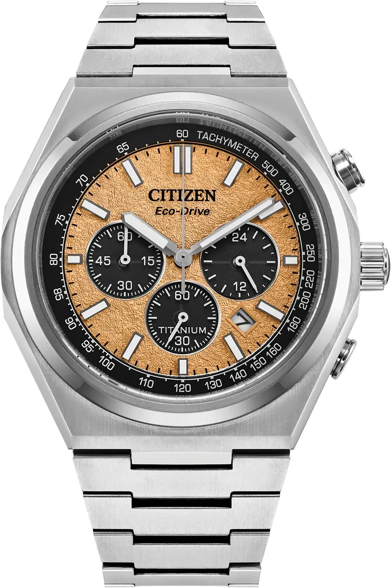 Pairing classic proportions with a distinctly modern style, meet the new Zenshin Super Titanium™. Featuring a silver-tone Super Titanium™ case paired with stylish stepped chronograph pushers and a stylised crown, the finely brushed and polished timepiece is secured to the wrist with a matching integrated bracelet. On the dial, a textured salmon colour is accented with an outer tachymetric scale and triple register configuration in black, with details in silver-tone and white used for the handset and applied indices. Features include running time, a split-second chronograph, 12/24 hour time, and date. Sustainably powered by any light with Eco-Drive technology and never needs a battery. Water resistant to 100 metres.
