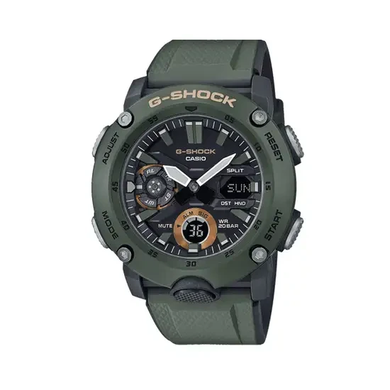 Notable features include a carbon fiber-reinforced case, guardless buttons, front light button, a double case back structure, & multi-color resin bands. The Carbon Core Guard gives the GA-2000 a very light weight at 64 grams which is lighter than the GA-100. The display has a 3D index with high-contrast analog hands, LCD subdisplays, and a menu subdial.