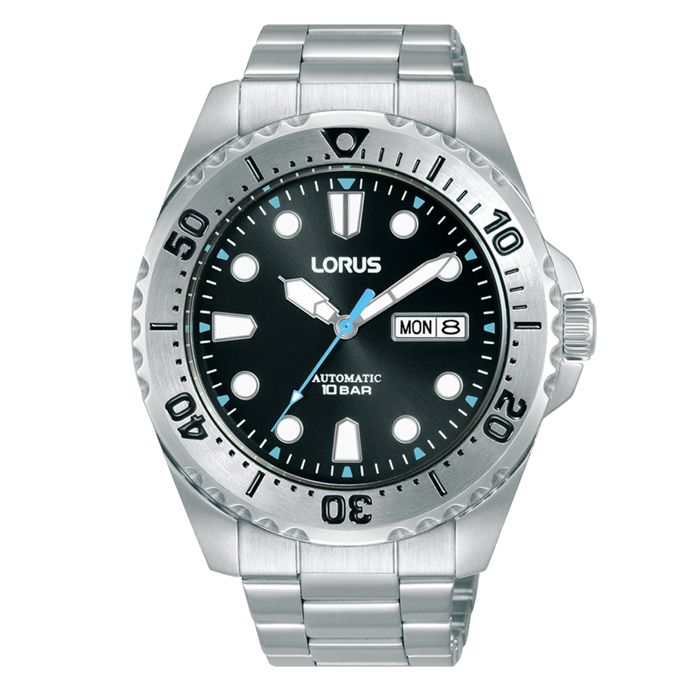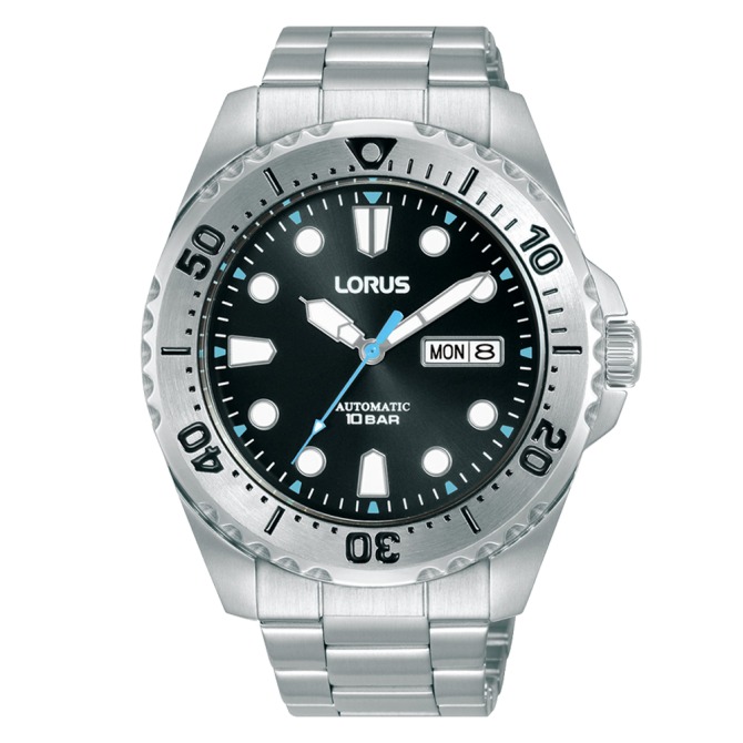 Within the classic case, the black sunray dial features luminous markers and hands, with light blue accents, ensuring clarity in various lighting conditions. Its numerical bezel and day/date window at the 3 o’clock mark add an extra layer of utility and, with a water resistance of up to 100 metres, this watch is not only elegant but also suitable for swimming and sports – a testament to durability and reliability.