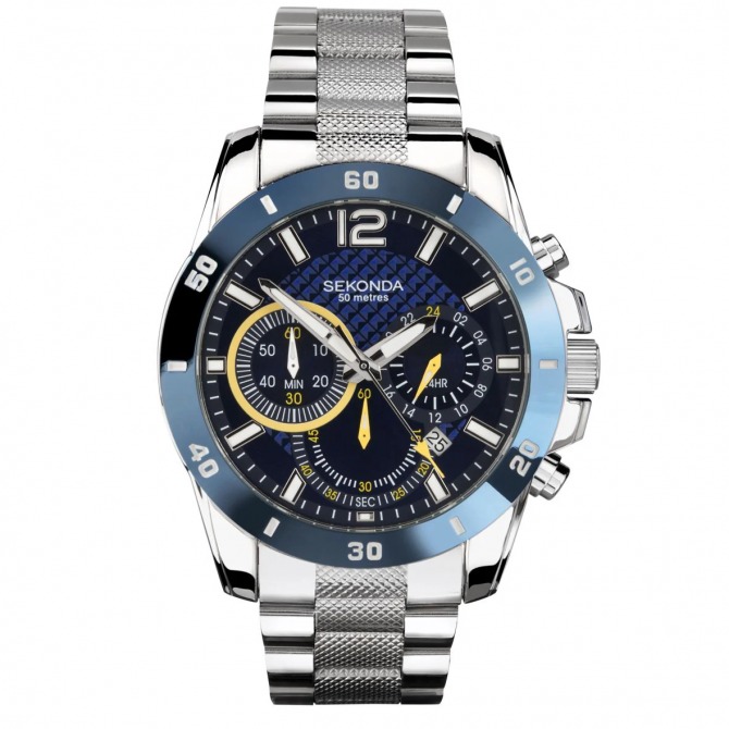 This watch features a silver coloured ionic plated case with a blue bezel housing a blue dial with yellow features and a date display. The watch is fastened with a stainless steel bracelet. The functions include 1 second chronograph timing up to 1 hour, a 24-hour read-out and water resistance to 50m.