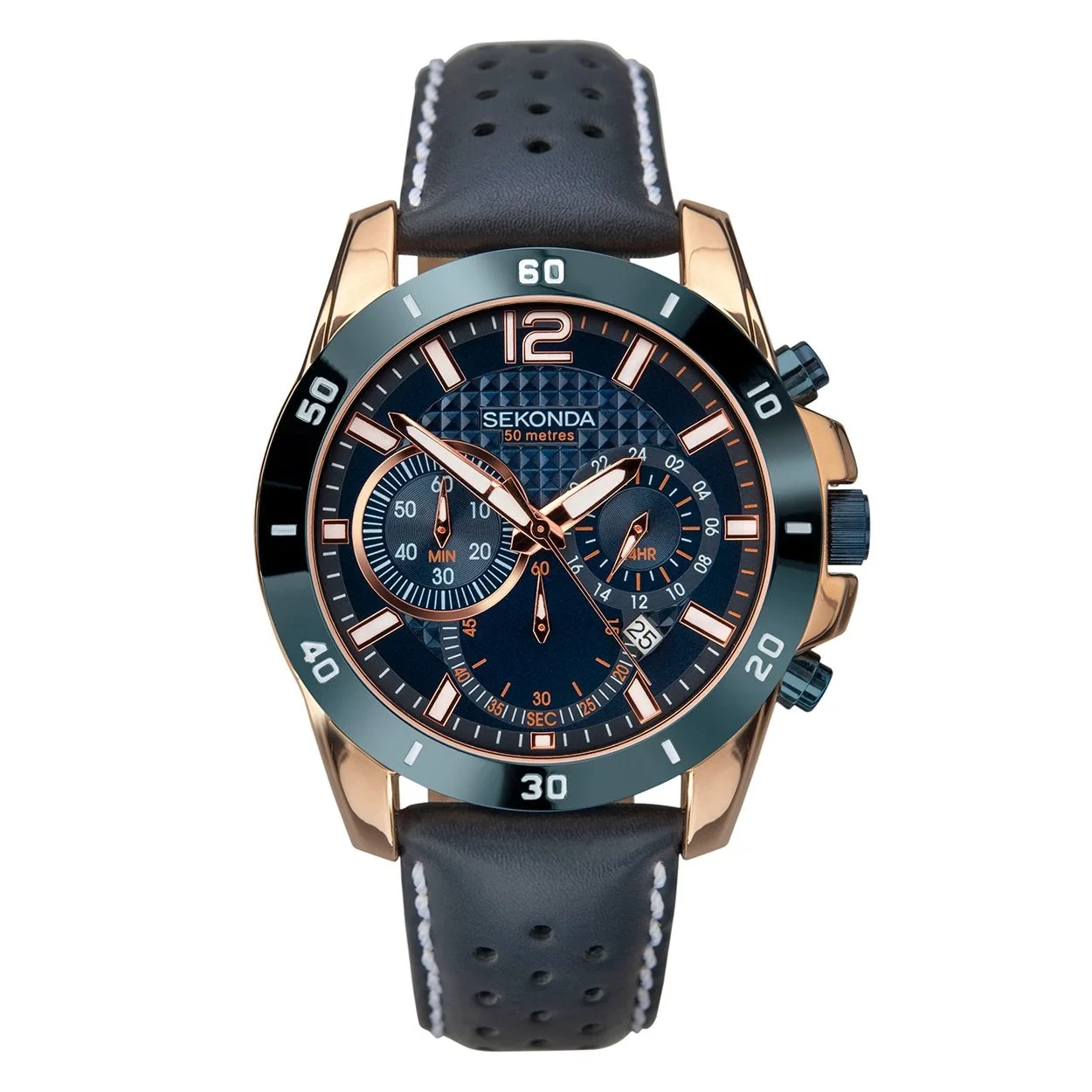Opt for bold wrist designs with this Sekonda watch. The chronograph combines a dynamic appeal with multi-level timekeeping. It features three sub-dials, including a 24-hour display and a 1-second chronograph timing up to 1 hour. A date functionality complements this style. The bold hands & indices provide enhanced visibility in dim-light conditions. The watch is set in polished stainless steel and has a protective glass. Complete with a supple yet resilient leather strap with a laser-cut styling and pin and buckle clasp.