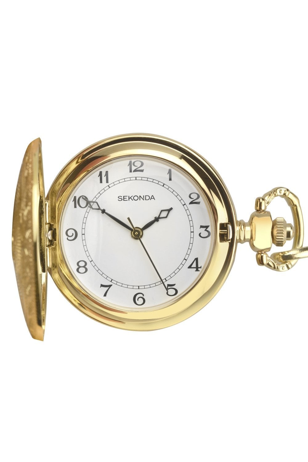 This timepiece features a round gold plated case with a hinged lid enclosing a cream dial with Gilt Arabic figures. The watch is completed with a distinctive gold plated fob chain.