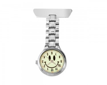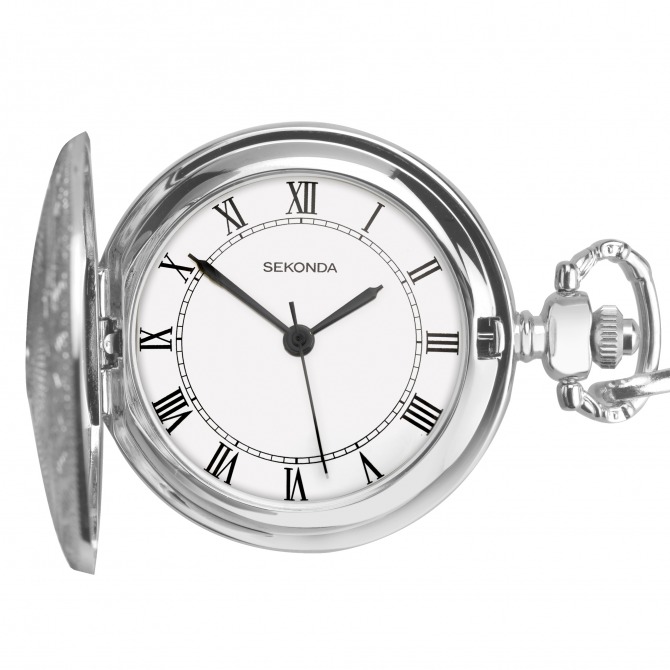 This timepiece features a round stainless steel case with a hinged lid enclosing a white dial with Gilt Arabic figures. The watch is completed with a distinctive stainless steel fob chain.